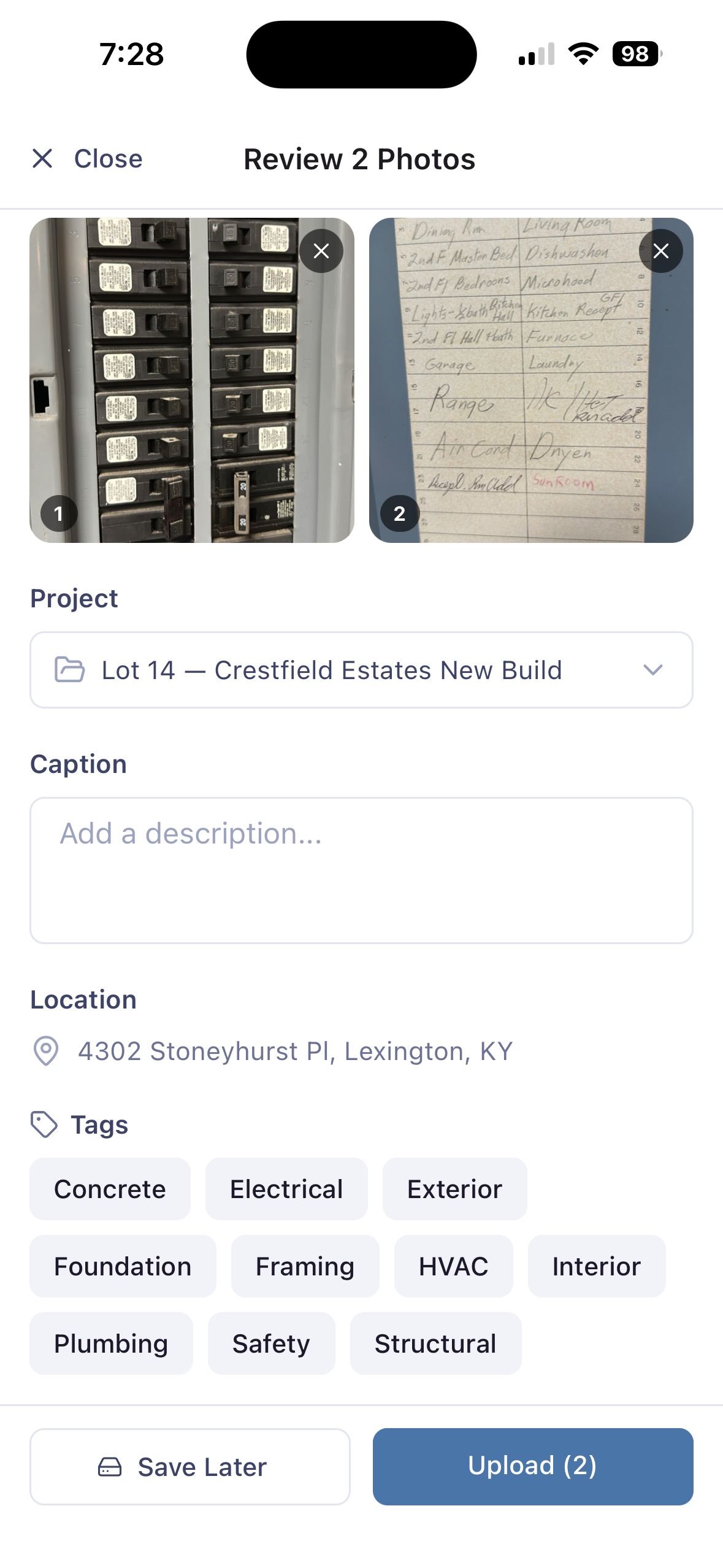 Associate captured media directly with a project and lot number for instant organization.