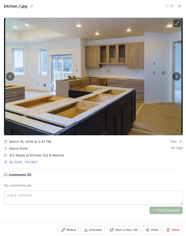 Filter your media library by address, project, or GPS coordinates from the web dashboard.